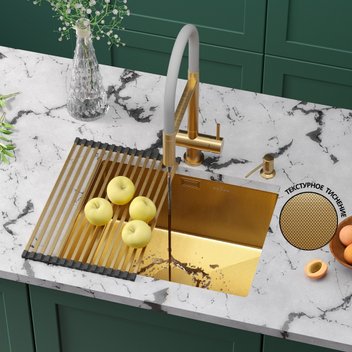 Кухонная мойка Roxen Uno 560210-54G-GR золото/текстурная PVD покрытие (с ролл-матом и дозатором)